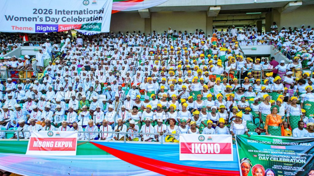 That message came into focus on Saturday, 7 March 2026, when the state hosted Nigeria’s First Lady, Senator Oluremi Tinubu, at the Godswill Akpabio International Stadium in Uyo for the International Women’s Day celebration. The event, held under the theme, “Rights, Justice, Action, For All Women and Girls,” also coincided with activities surrounding the commissioning of the ARISE Senior Citizens’ Centre along the Uyo, Ikot Ekpene Road.
