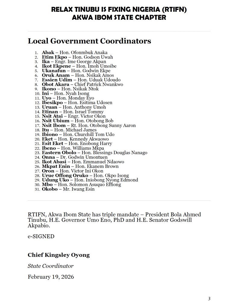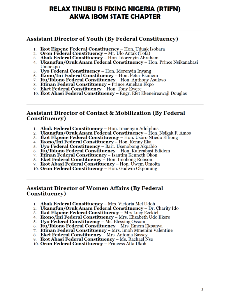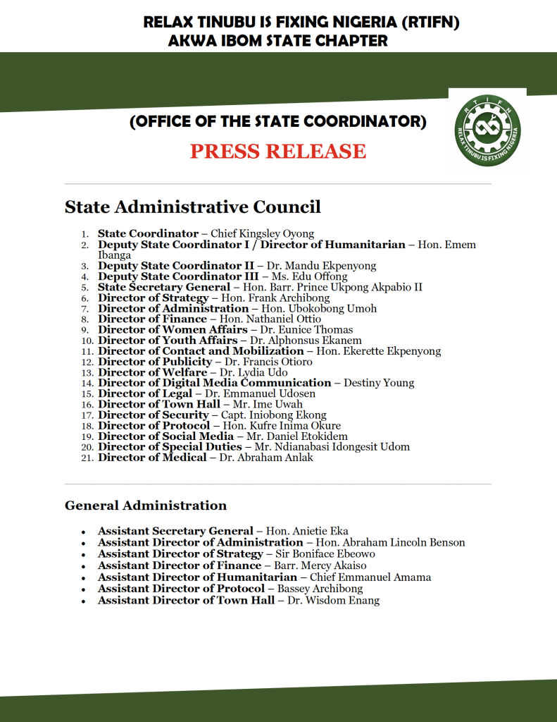 A political support group, Relax Tinubu is Fixing Nigeria (RTFIN), has released the full organisational structure of its Akwa Ibom State chapter, signalling an expansion of its grassroots mobilisation across the state.