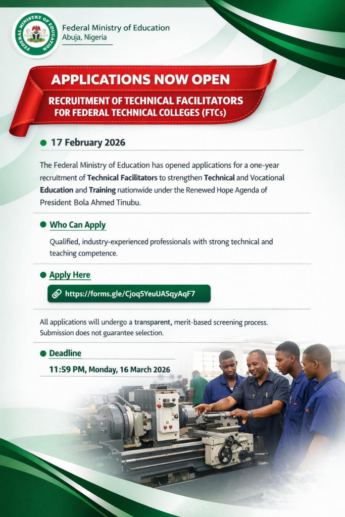 The Federal Government has opened an online application portal for the strategic recruitment of Technical Facilitators to support the revitalisation of Federal Technical Colleges across Nigeria, the Federal Ministry of Education has announced.