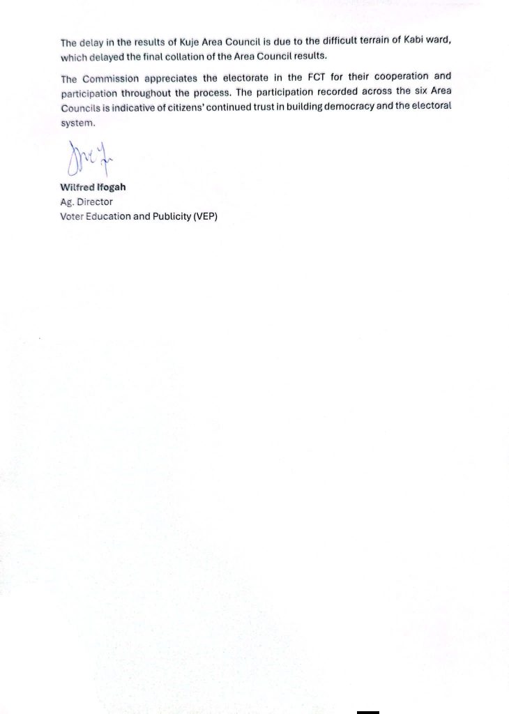 INEC attributed the delay in the Kuje Area Council results to the challenging terrain in Kabi ward, which slowed the final collation process.
