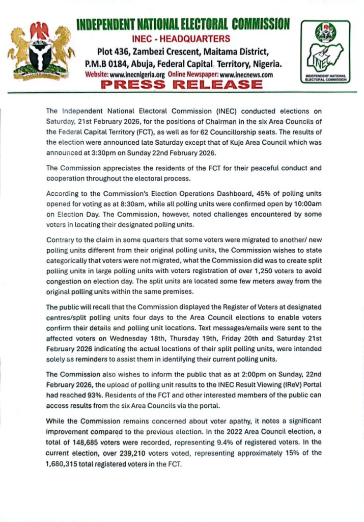 The Independent National Electoral Commission has confirmed the successful conduct of elections for the six Area Councils of the Federal Capital Territory, with voting held on Saturday 21 February 2026.