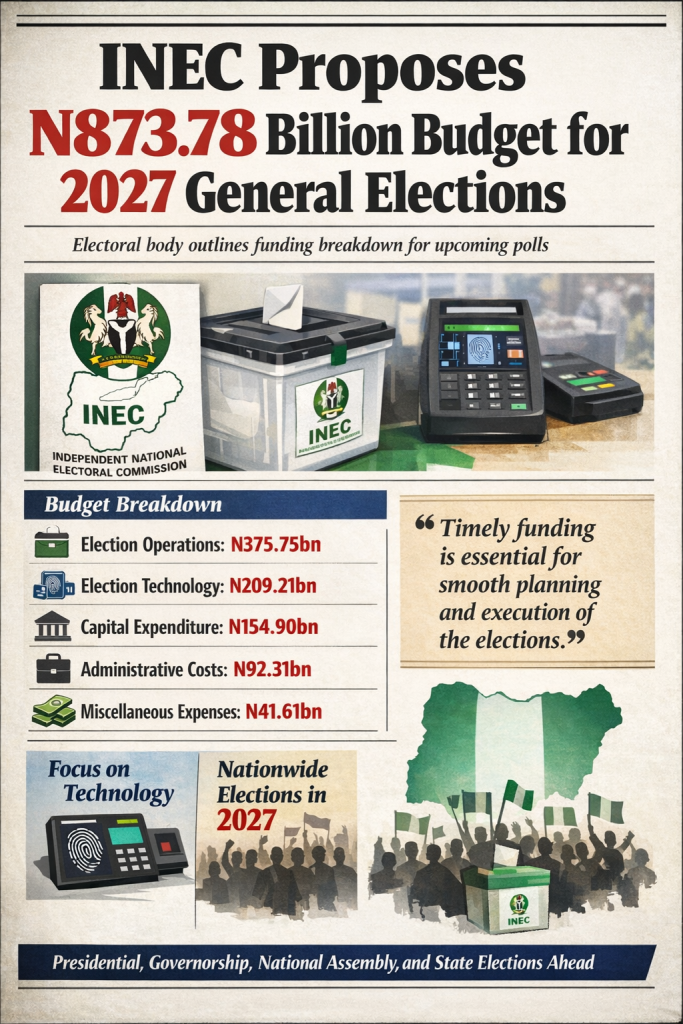 The Independent National Electoral Commission has proposed a budget of N873.78 billion for the conduct of Nigeria’s 2027 general elections, signalling the formal commencement of preparations for the nationwide polls.