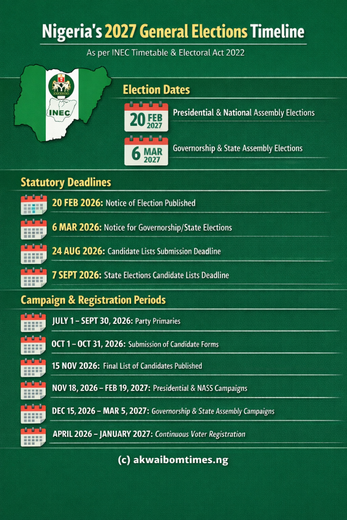 The Independent National Electoral Commission has fixed February 20, 2027, for the Presidential and National Assembly elections, while governorship and state assembly polls will follow on March 6, 2027.