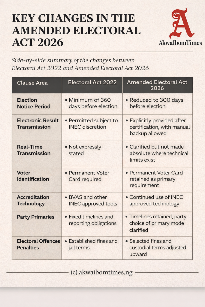The Amended Electoral Act 2026 sets the legal framework for the 2027 elections. Supporters argue that it balances innovation with practicality and reduces uncertainty for election managers and political parties. Critics remain concerned that flexibility in results transmission could affect public confidence if not transparently implemented.