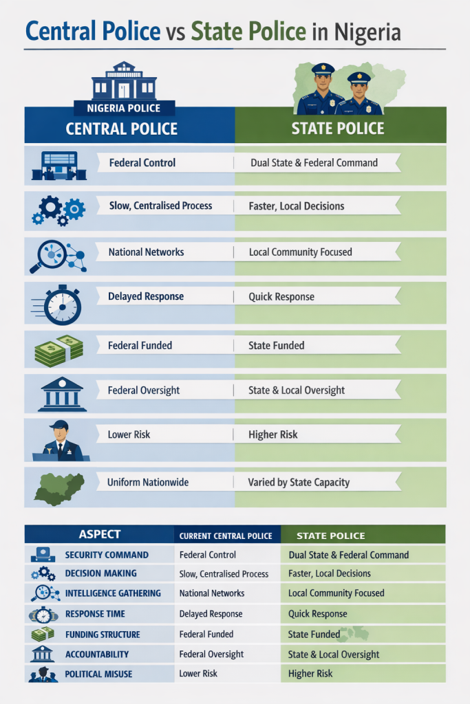 The proposal for state police represents a major institutional reform within Nigeria’s security system. The debate reflects growing concern that the present centralised structure struggles to address diverse security threats across the country.
